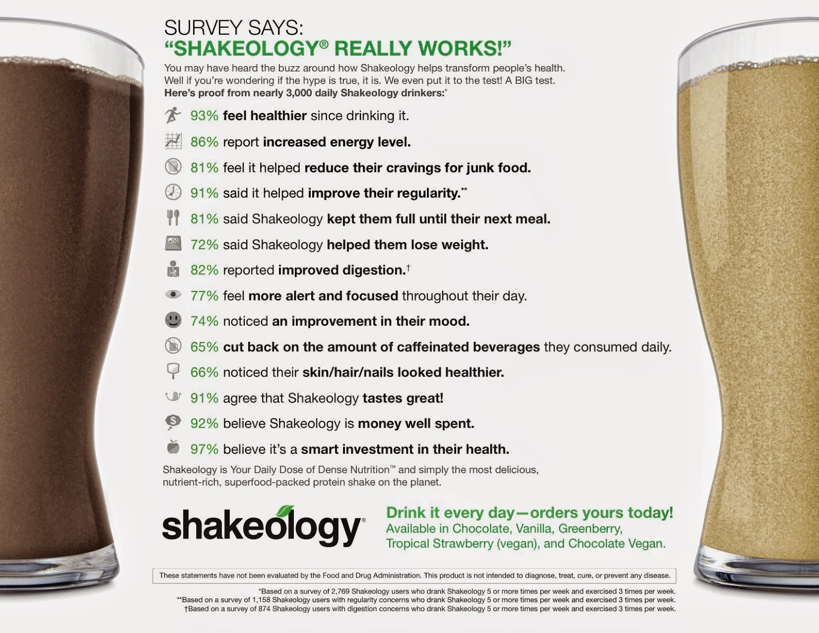 - Shakeology will help reduce cravings. Proteins and fiber help to reduce cravings for junk food and sugary treats and keep you full for up to 3 hours. Drink one before you head out to a holiday party and you won’t feel tempted to nosh on everything in site! And Shakeology taste so good it’s like a treat itself.