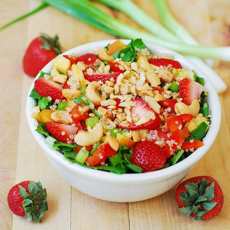 In a large bowl, combine all of the salad ingredients, except the cashew nuts. Add the dressing to the salad and toss. Sprinkle cashew nuts on top of the salad.
